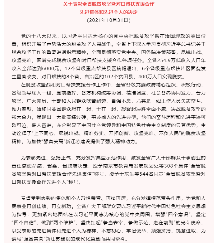 党的十八大以来,以习近平同志为核心的党中央组织开展了声势浩大的脱贫攻坚人民战争,江苏新利体育董事长徐雪宏以赤诚之心,积极响应省市各级党委政府的号召,矢志奋斗、倾力奉献,投身各项脱贫攻坚战和对口帮扶合作工作。2021年10月31日,中共江苏省委、江苏省人民政府下发《关于表彰全省脱贫攻坚暨对口帮扶支援合作先进集体和先进个人的决定》,授予徐雪宏董事长全省脱贫攻坚暨对口帮扶支援合作先进个人称号。